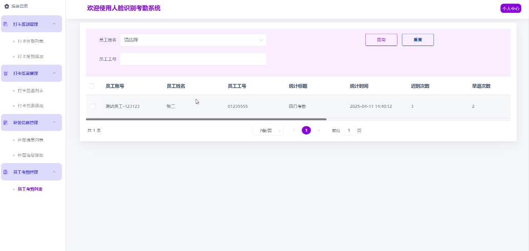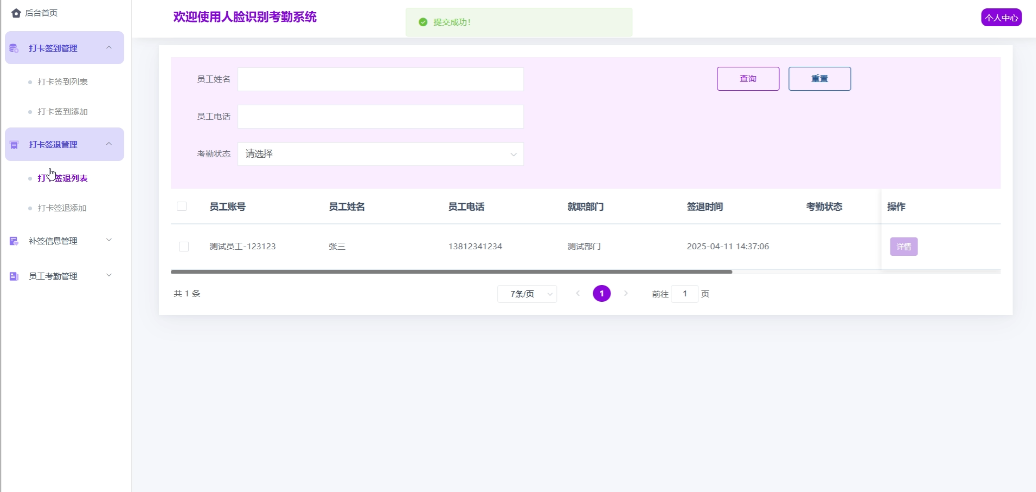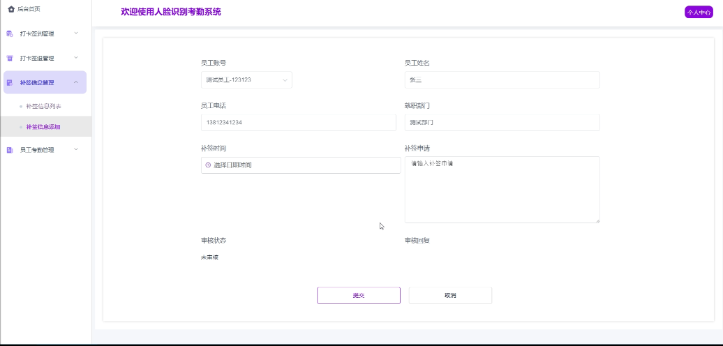 - 补签信息管理:员工用户可以管理自己的补签信息,支持添加新的补签信息,查询现有的补签信息,确认审核状态。