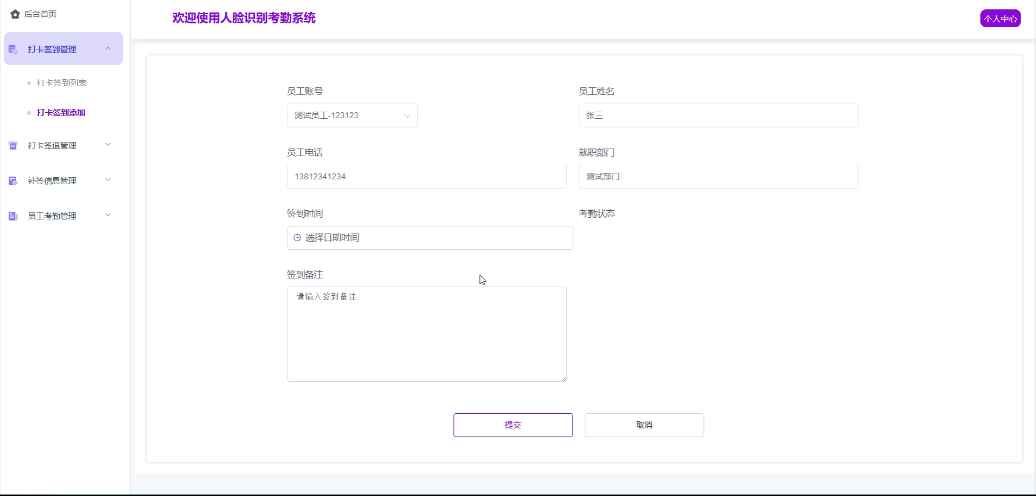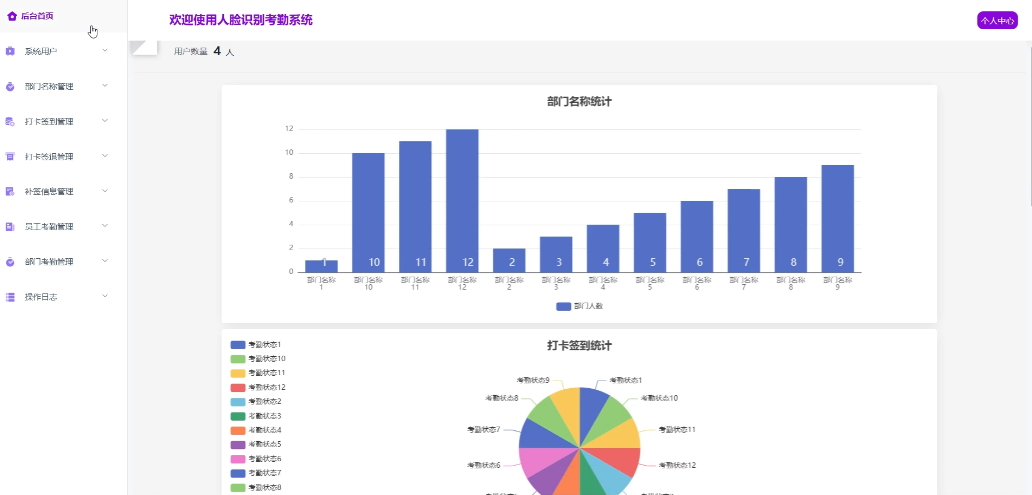 - 后台首页:管理员登录后的主页,展示系统的重要信息概览、个人资料及统计信息(包括部门名称、打卡签到、补签信息、员工考勤、部门考勤等统计图)。