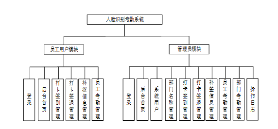 功能模块设计是系统开发过程中的重要阶段,它旨在将系统划分为不同的模块,每个模块负责完成特定的功能或任务。人脸识别考勤系统由多个功能模块组成,每个模块下又包含具体的功能操作。员工用户可进行在线签到、签退和补签,确认自己的考勤信息。系统管理员则负责管理系统所有数据,处理审批各类请求。根据前文功能需求分析,可以得出本系统的功能模块图如下所示。