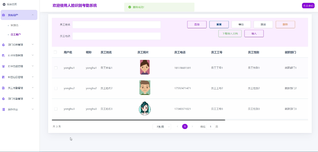 - 系统用户:管理员可以管理系统用户(管理员和员工用户),包括增删查改用户信息,重置用户密码等,支持批量导出导入。