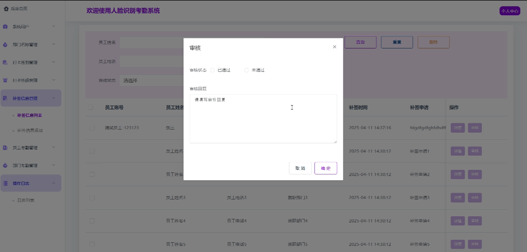 - 补签信息管理:管理员可以管理所有的补签信息,包括浏览详情,实现增改删查操作,负责审核员工提交的补签信息。