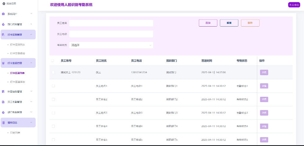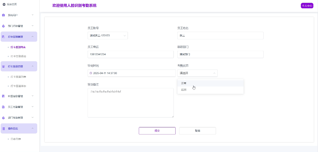 - 打卡签到管理:管理员可以处理所有的打卡签到,包括浏览详情,实现增改删查操作,负责根据操作日志的实际打卡情况,判定员工是否正常或迟到,更新考勤状态。