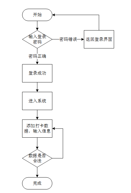 登录系统后,用户可对添加自己权限内的打卡数据,输入打卡数据提交后,系统会验证数据是否合法,合法后会保存并更新数据库,若不合法则提示重新输入。添加打卡数据流程图所示。