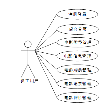 基于java的电影售票系统中员工用户包登录注册、后台首页、电影类型管理、电影信息管理、电影购票管理、电影退票管理、电影评价管理等功能。员工用户用例图如下所示: