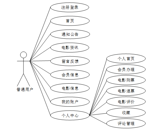 基于java的电影售票系统中普通用户包含登录注册、首页、通知公告、电影资讯、留言反馈、会员信息、电影信息、我的账户、个人中心(个人首页、会员办理、电影购票、电影退票、电影评价、收藏、评论管理)等功能。普通用户用例图如下所示: