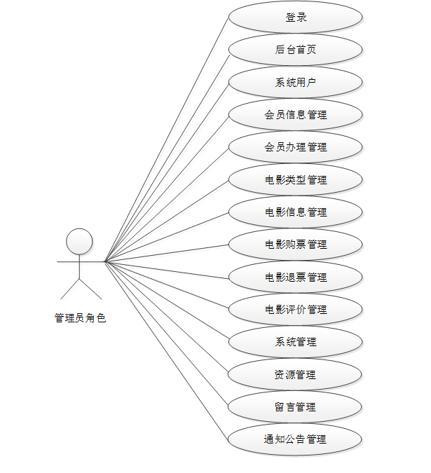 基于java的电影售票系统中管理员包含登录、后台首页、系统用户、会员信息管理、会员办理管理、电影类型管理、电影信息管理、电影购票管理、电影退票管理、电影评价管理、系统管理、留言管理、通知公告管理、资源管理等功能。管理员用例图如下所示: