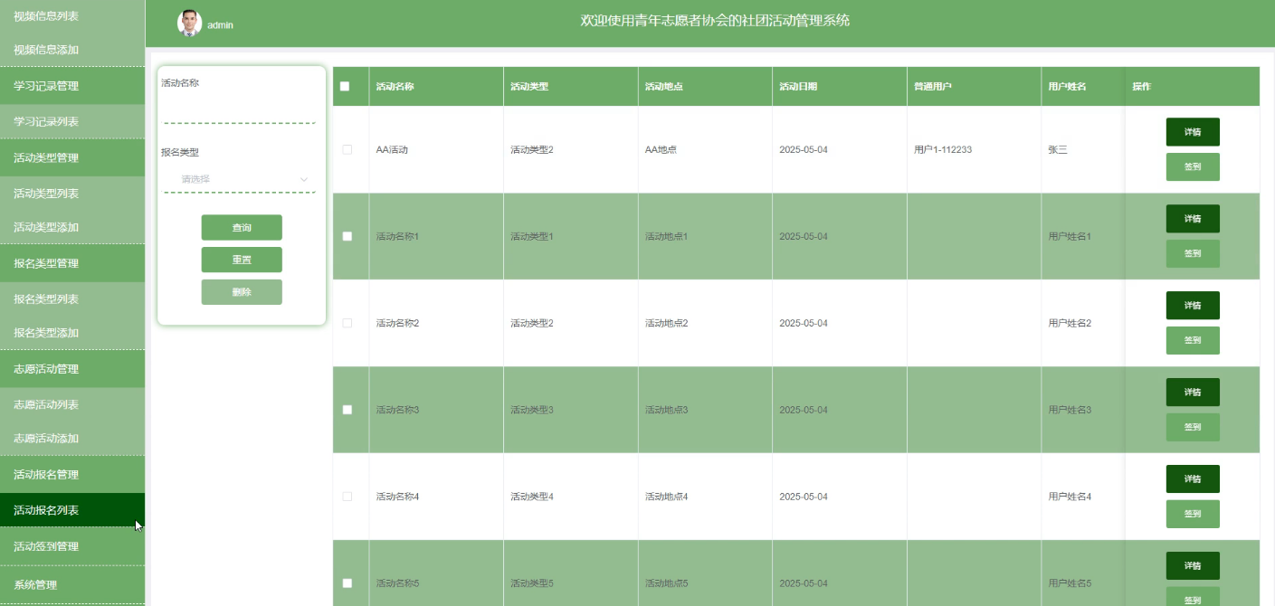 - 活动签到管理:管理员可以删除和查询活动签到记录,查看详细签到情况,确保活动参与的准确统计。