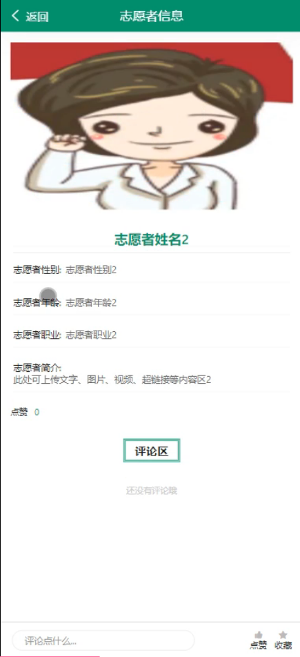 - 志愿者信息:用户可以浏览其他志愿者的资料,点赞、收藏或评论,以表达支持和鼓励,促进社区互动。