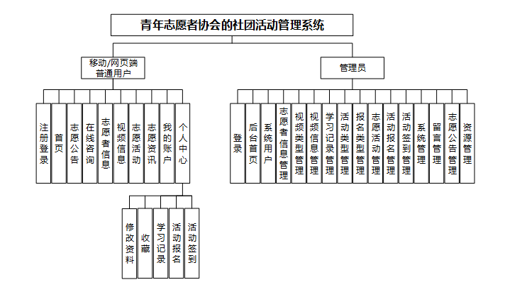 青年志愿者协会的社团活动管理系统划分为了小程序端、网页端和管理后台三大模块。