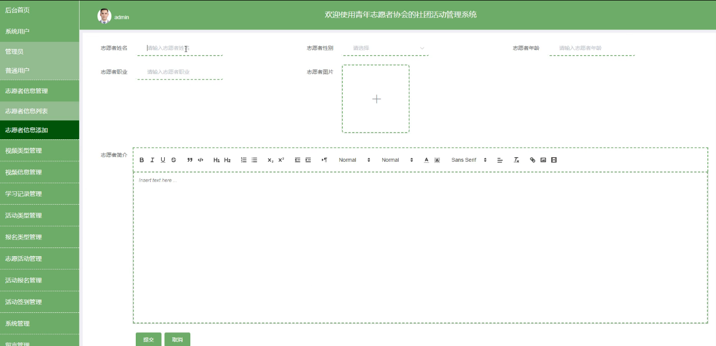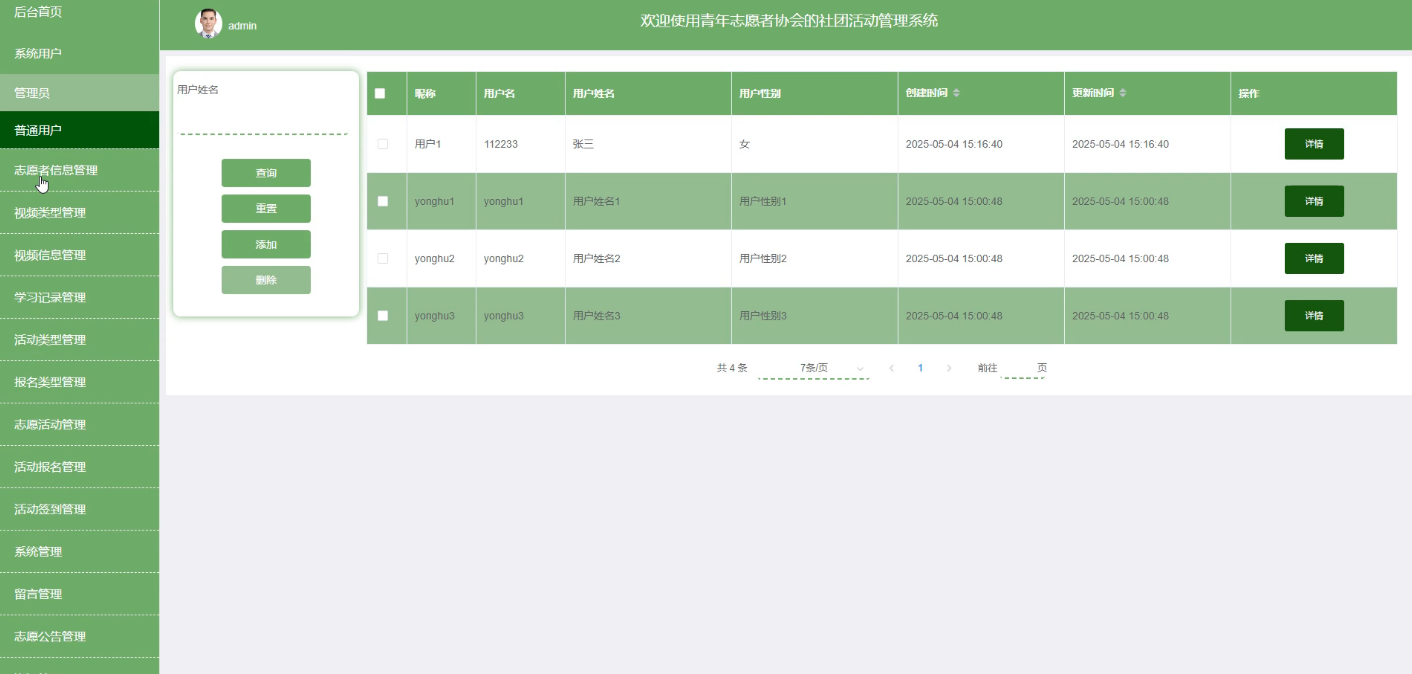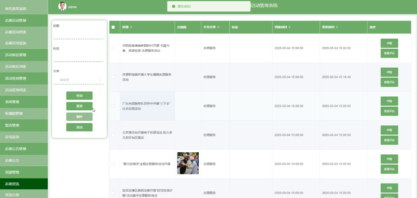 - 志愿活动管理:管理员可以添加、删除和查询志愿活动,查看活动详情和评论,确保活动信息的准确性和及时更新。