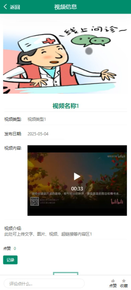 - 视频信息:用户可以观看与志愿活动相关的教育和宣传视频,对喜欢的视频进行点赞、收藏和评论,并记录自己的学习进度,方便跟踪学习情况。