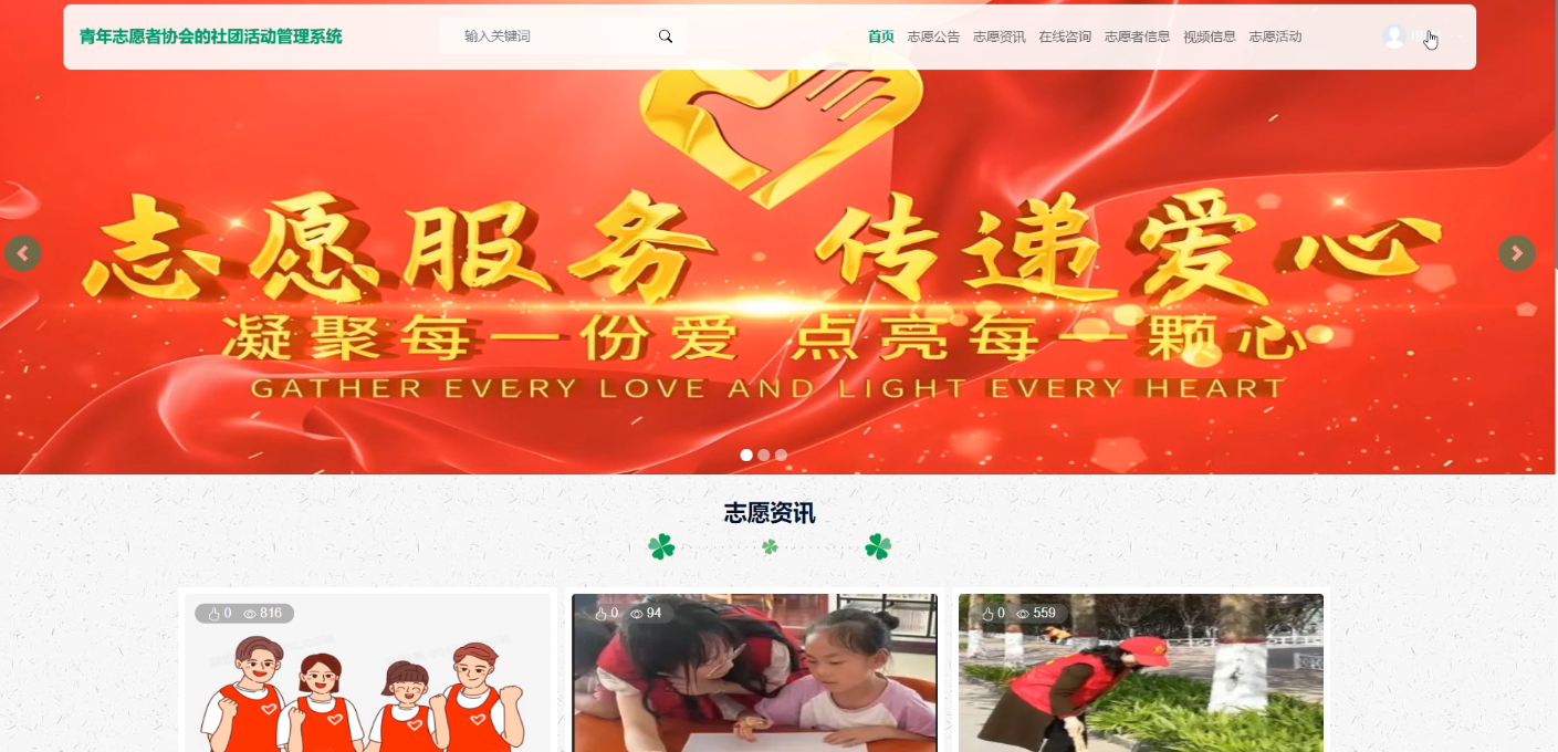 - 首页:首页设计简洁明了,包含轮播图展示最新动态,志愿公告区域发布重要通知,志愿资讯板块提供各类志愿相关信息,以及志愿活动列表供用户浏览和参与。