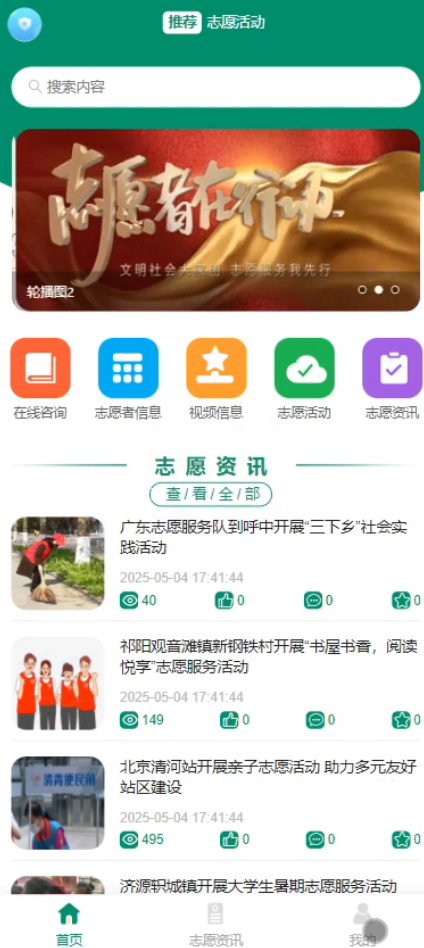 - 志愿资讯:此模块提供丰富的志愿资讯文章,用户可以浏览并了解志愿领域的最新动态、知识和故事,同时可以对文章进行点赞、收藏和评论。
