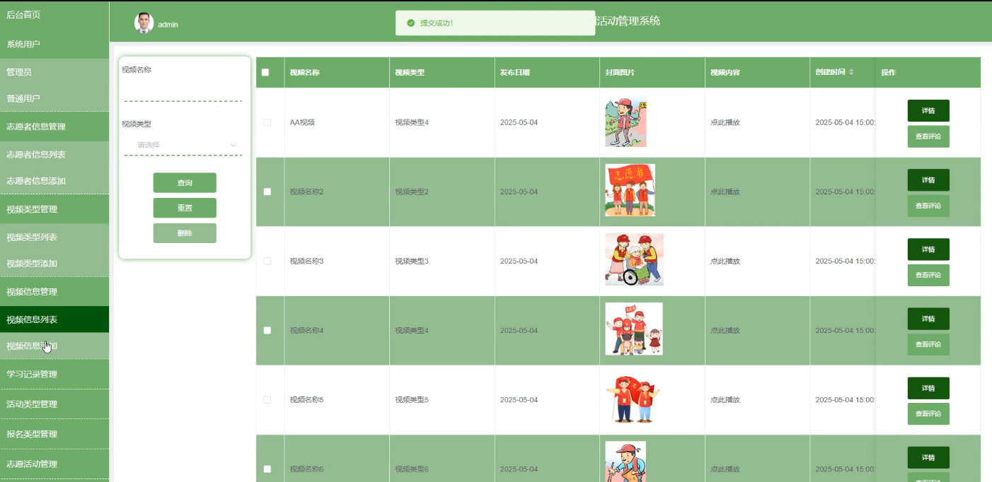 - 视频信息管理:管理员可以添加、删除和查询视频信息,查看视频详情以及管理评论,确保视频内容的质量和相关互动。