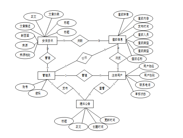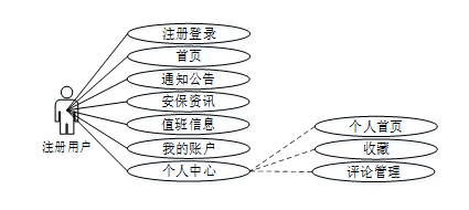 注册用户是系统的主要使用者之一,拥有注册登录、首页、通知公告、安保资讯、值班信息、我的账户、个人中心等功能。注册用户角色用例如下图所示。