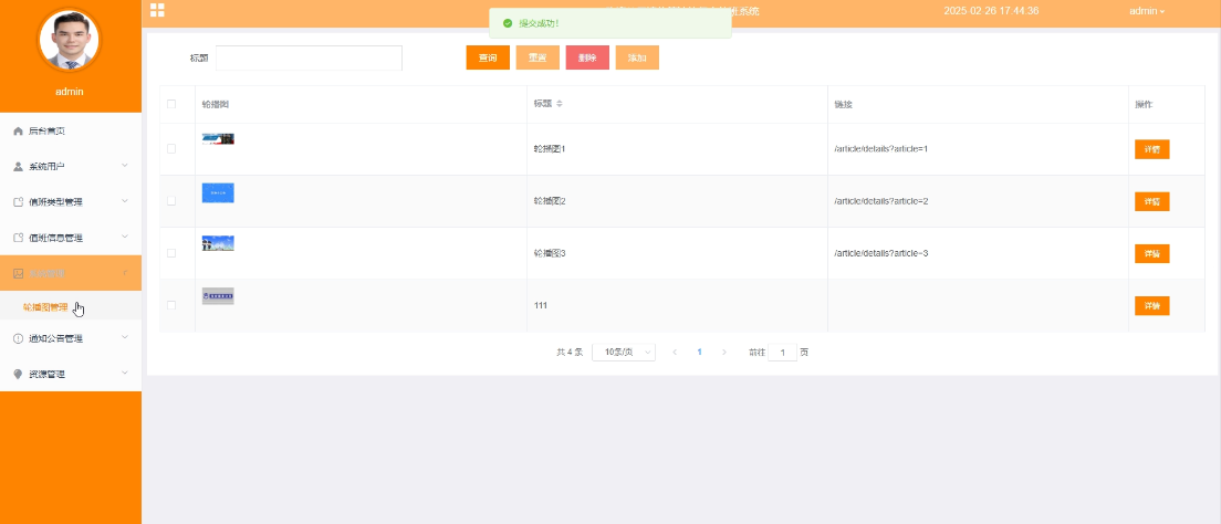 - 通知公告:提供系统公告通知信息,让注册用户及时了解系统最新信息内容。