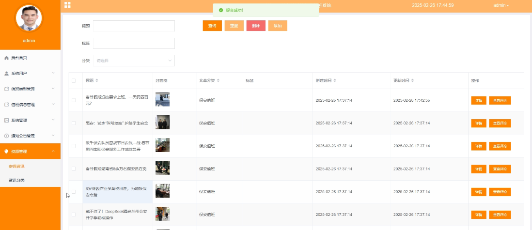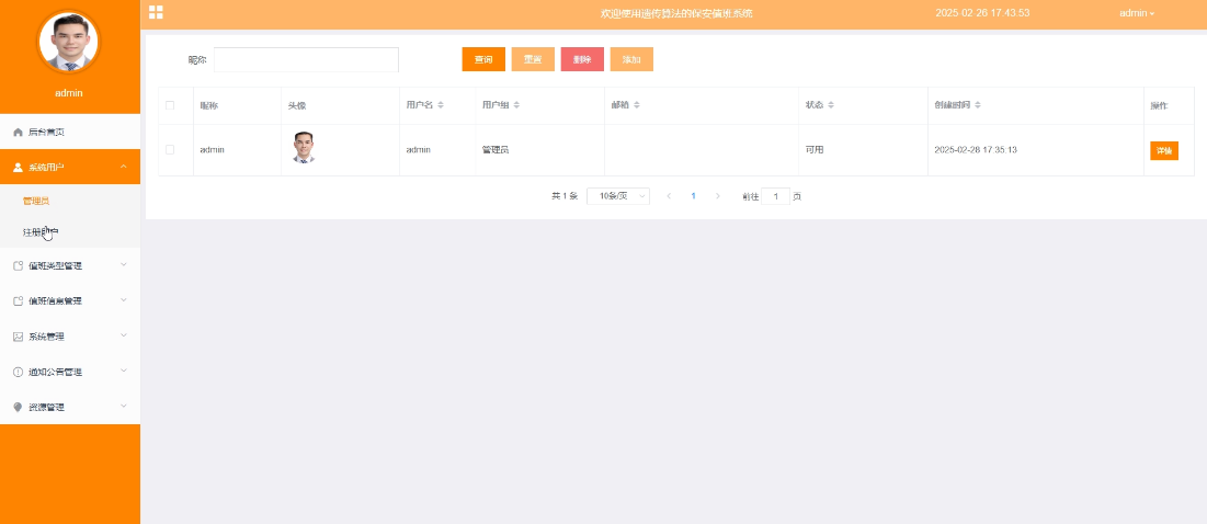随着社会的不断发展和安全意识的增强,保安人员的合理调度已成为维护公共安全的重要环节。传统的值班安排方法往往依赖人工经验,容易造成资源浪费或人员困扰。为了解决这一问题,本文引入信息化技术实现一套高效便捷保安值班系统,以提升保安值班管理效率。该系统采用Python编程语言,利用Django框架实现系统业务逻辑,使用MySQL数据库进行数据存储,并借助遗传算法对用户行为数据进行分析预测,以实现个性化服务,智能优化值班安排,实现资源的最优配置。面向注册用户和管理员两种角色,实现了包括注册登录、用户管理、值班类型管理、值班信息管理、系统管理、通知公告管理以及资源管理等核心功能,能够很好地满足值班管理业务流程。最终,通过测试,验证系统功能的有效性与稳定性。本系统的成功研发能够为社会公共安全管理提供新的思路和方法,不仅可以提高保安值班管理的效率,还增强了用户的个性化体验,在实际应用中具有重要的推广意义和应用前景。