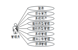 管理员是系统最高权限拥有者,涵盖了登录、后台首页、系统用户、值班类型管理、值班信息管理、系统管理、通知公告管理、资源管理等功能。管理员角色用例如下图所示。