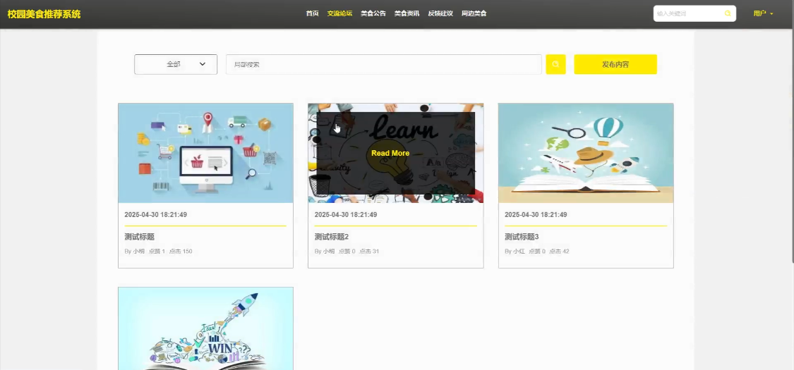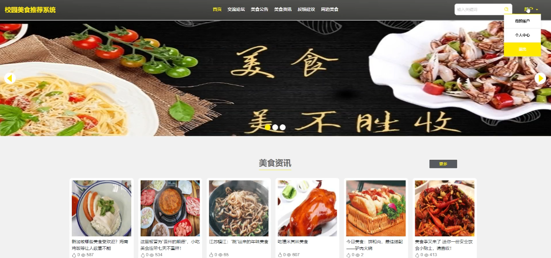 - 首页:展示系统的主要内容、信息概览和功能入口,让用户快速了解系统的最新动态,实现周边美食推荐功能(使用k-means,对用户的点击、评论、收藏及点赞等行为数据进行统计、分析与预测,推荐用户更可能感兴趣的内容)。