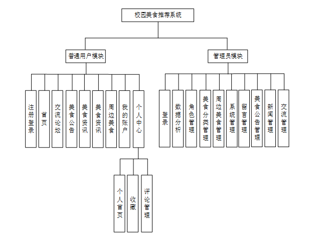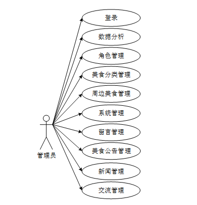 通过对应的功能做了需求分析以后该校园美食推荐系统各角色主要包括的功能说明如下。