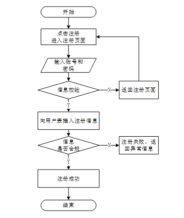 注册的过程,第一部分是账号的注册,第二部分是信息完善。在业务开展过程中,管理员可对用户信息进行修改等管理操作,注册流程如图3.3用户注册流程图所示。