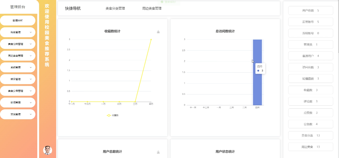- 数据分析:展示系统各类数据统计分析图表,管理员的个人信息等内容,并提供系统相关操作入口,方便管理员快速进行管理和监控。