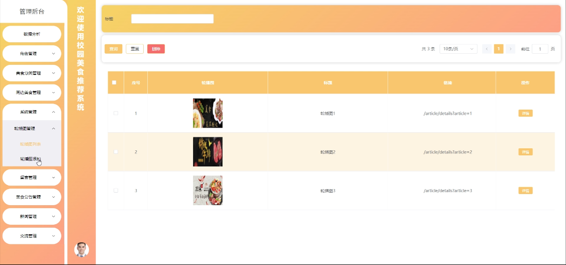 - 系统管理:可以对前台展示的轮播图进行设置,允许管理员上传、更新、删除轮播图,并支持附带相应图片跳转链接。