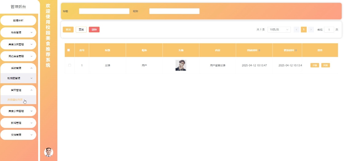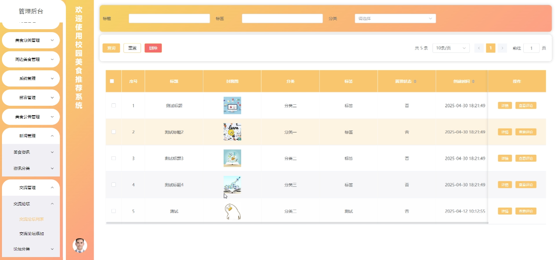 - 周边美食管理:提供周边美食的管理功能,支持管理员发布、编辑、删除和搜索周边美食,及查看相关评论内容,确保及时更新周边美食信息和维护评论内容。