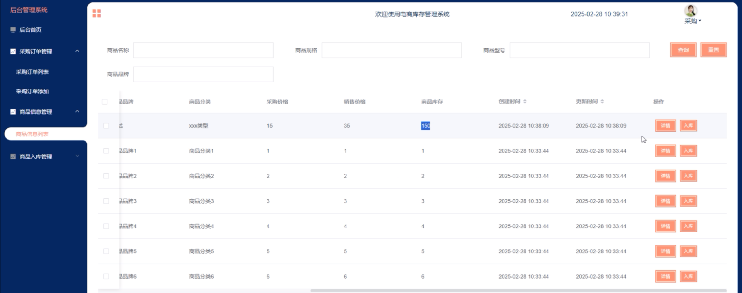 (3)商品信息管理:采购用户点击可查看商品信息列表,点击“入库”按钮可添加入库信息,包括入库时间和入库数量。