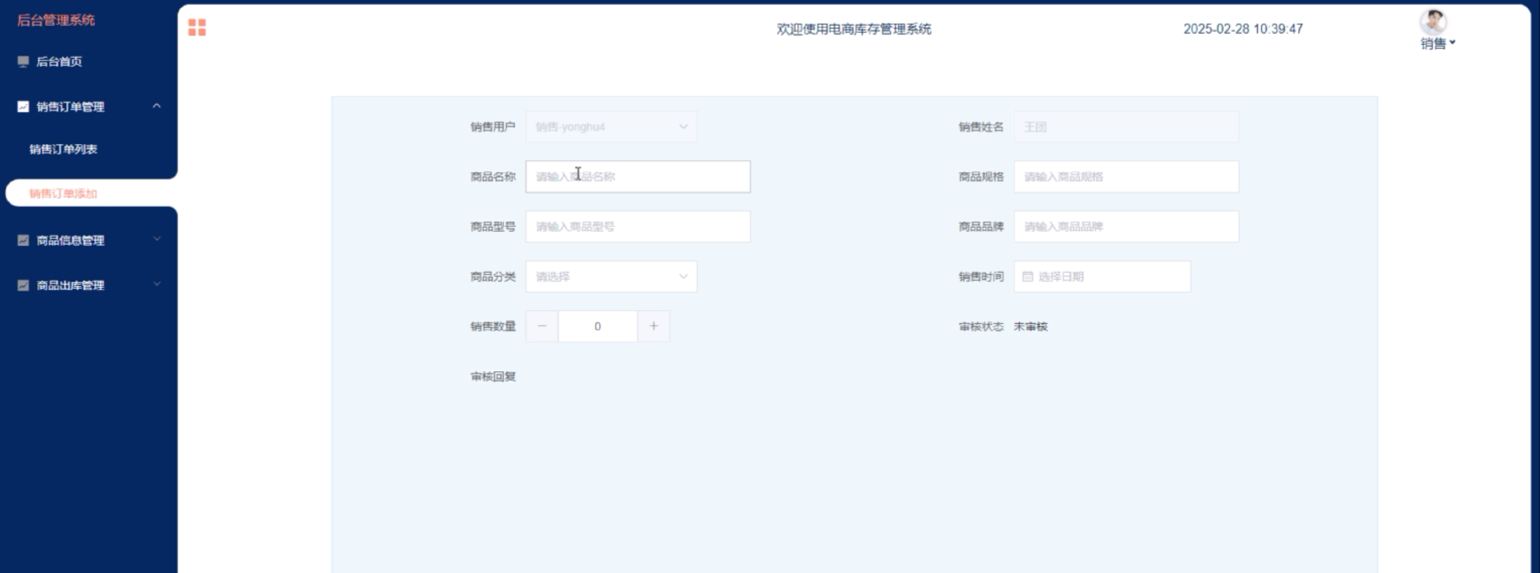 (2)销售订单管理:销售用户点击可查看销售订单列表和销售订单添加;点击进入“销售订单添加”可填写相关信息,包括销售用户、销售姓名、商品名称、商品规格、商品型号、商品品牌、商品分类、销售时间、销售数量。