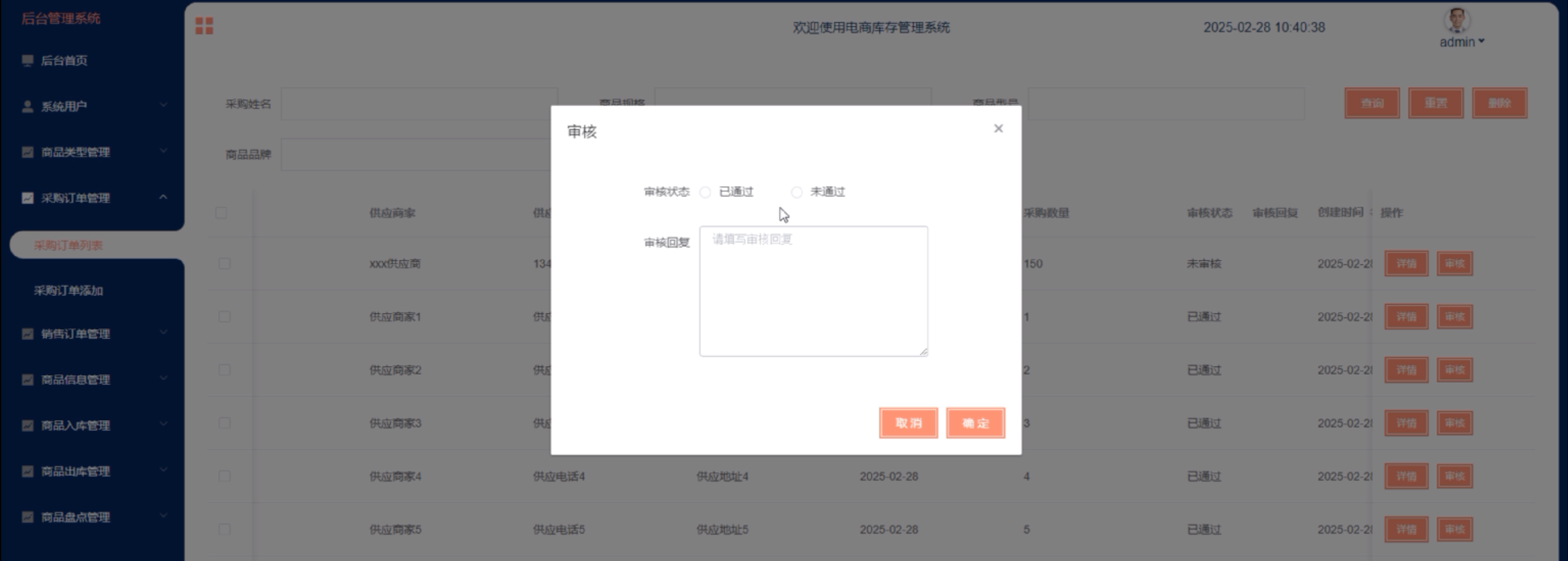 (5)采购订单管理:管理员点击可查看采购订单列表,可对采购用户添加的采购信息进行审核回复,同时可对采购订单进行增删改查。
