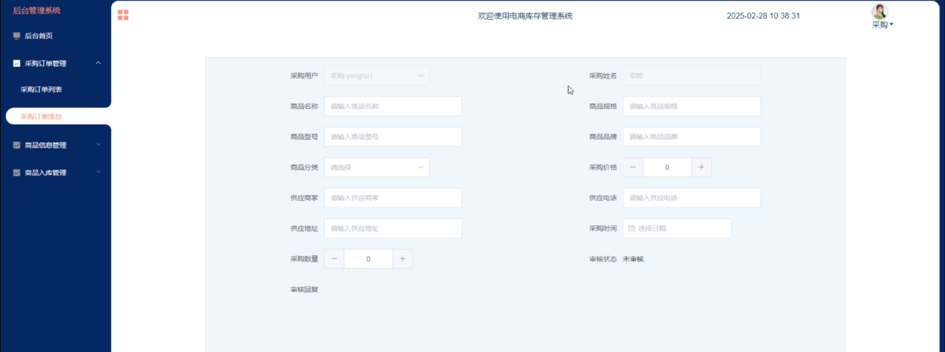 (2)采购订单管理:采购用户点击可查看采购订单列表和采购订单添加;点击进入“采购订单添加”可填写相关信息,包括采购用户、采购姓名、商品名称、商品规格、商品型号、商品品牌、商品分类、采购价格、供应商家、供应电话、供应地址、采购时间、采购数量。