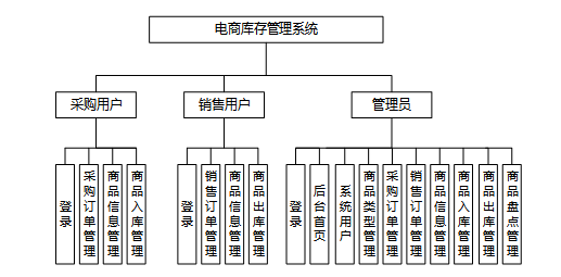 电商库存管理系统主要涉及有采购用户、销售用户和管理员三个角色。每个角色对应的功能模块如图所示。