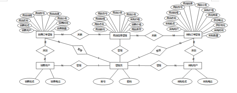 在数据库概念模型设计的时候,一般都采用E-R实体图进行展示,在实体图中可以展示出数据库表中的所有字段名称。下面是整个电商库存管理系统中主要的数据库表总E-R实体关系图。