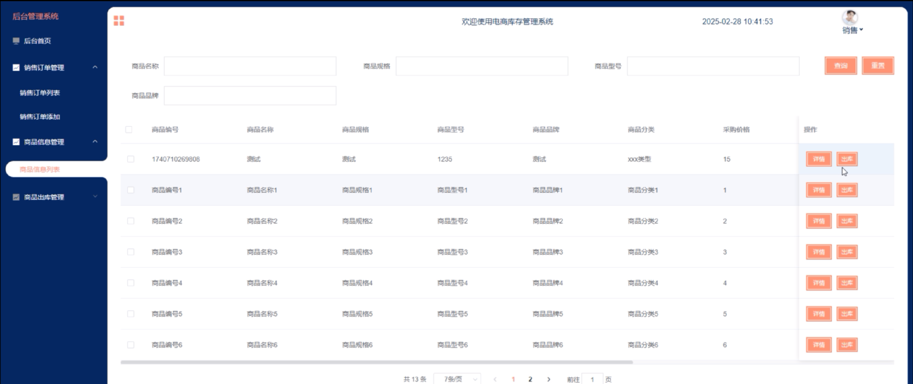 商品信息管理:销售用户点击可查看商品信息列表,点击“出库”按钮可添加出库信息,包括出库时间和出库数量。界面如下图所示。