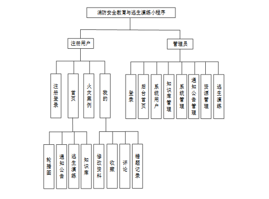 整个消防安全教育与逃生演练小程序是由多个功能模块组合而成的,根据用户需求分析,本系统主要可以划分为登录用户模块和管理员模块两大部分。各模块又可细分为不同的子功能设计,实现多角色协作,负责不同的职能,每个角色对应的功能模块如图所示。