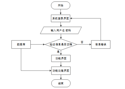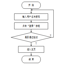 当用户进入登录页面,输入用户名和密码等信息,此时系统将进行基本的输入验证,确认用户名和密码不为空,点击“登录”按钮提交登录请求后,系统将进一步研究用户名和密码是否匹配,验证成功则可成功登录,跳转至用户主界面;反之,提示错误返回登录界面。登录流程图如下图所示。