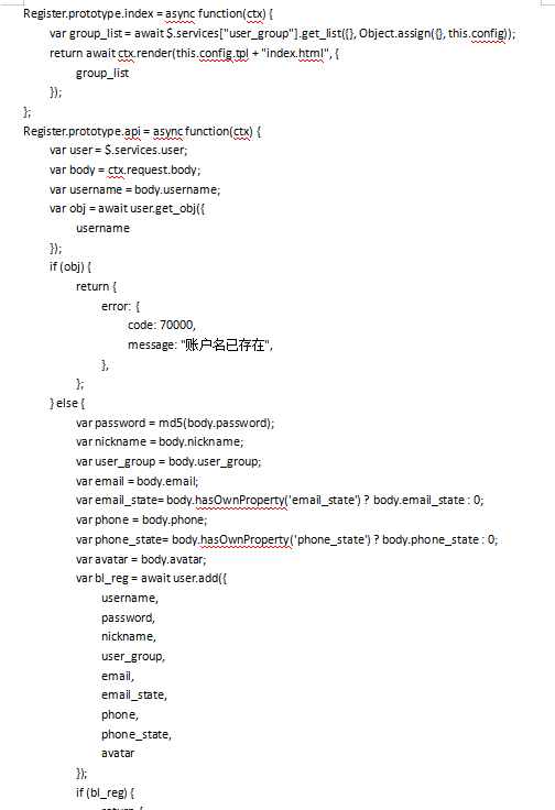 注册代码在controller文件下的register.js ,代码如下:其中包括md5加密,代码如图所示。