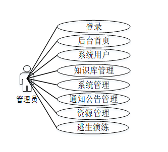 消防安全教育与逃生演练小程序中管理员则集成了登录、后台首页、系统用户、知识库管理、系统管理、通知公告管理、资源管理、逃生演练等功能。管理员用例图如下所示: