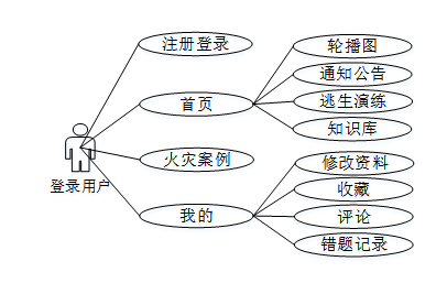 在消防安全教育与逃生演练小程序中登录用户包含注册登录、首页(通知公告、轮播图、逃生演练、知识库)、火灾案例、我的(修改资料、收藏、评论、错题记录)等功能。登录用户用例图如下所示: