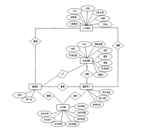 借助系统总体E-R图可以使其他用户快速轻松地了解系统的功能以及他们之间的关系。根据消防安全教育与逃生演练小程序各个实体和属性的分析结果,本消防安全教育与逃生演练小程序总体E-R实体关系图如下所示。