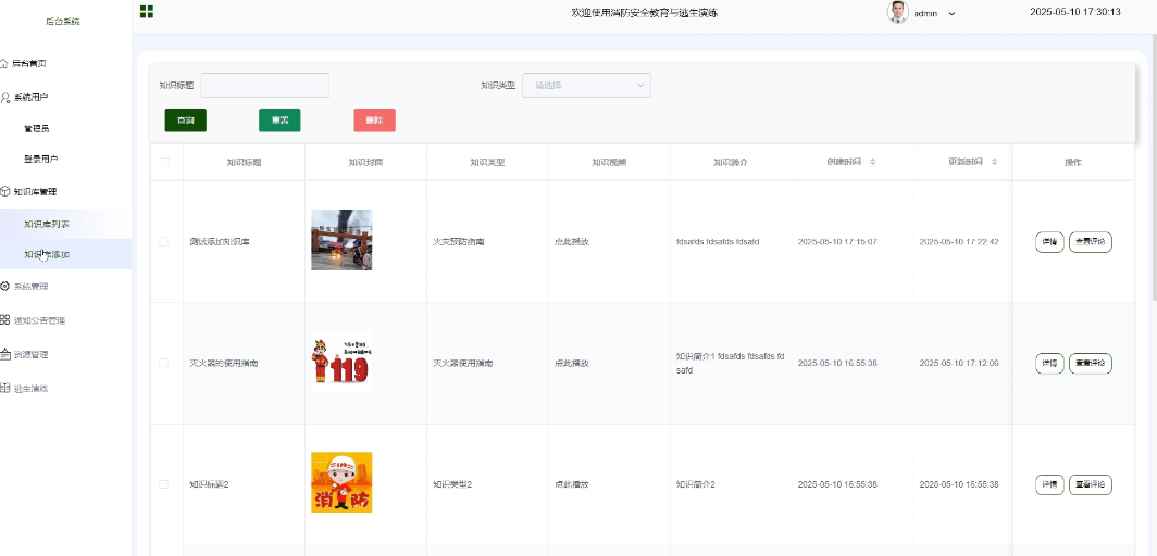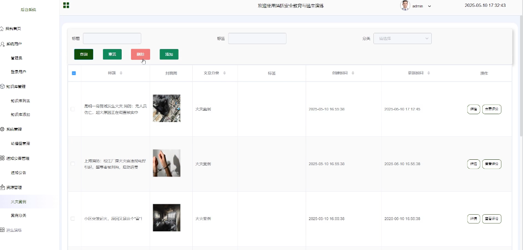 - 资源管理:管理员可管理火灾案例和案例分类的新增、编辑、删除等操作,提供搜索功能,支持对火灾案例的评论管控和查看。