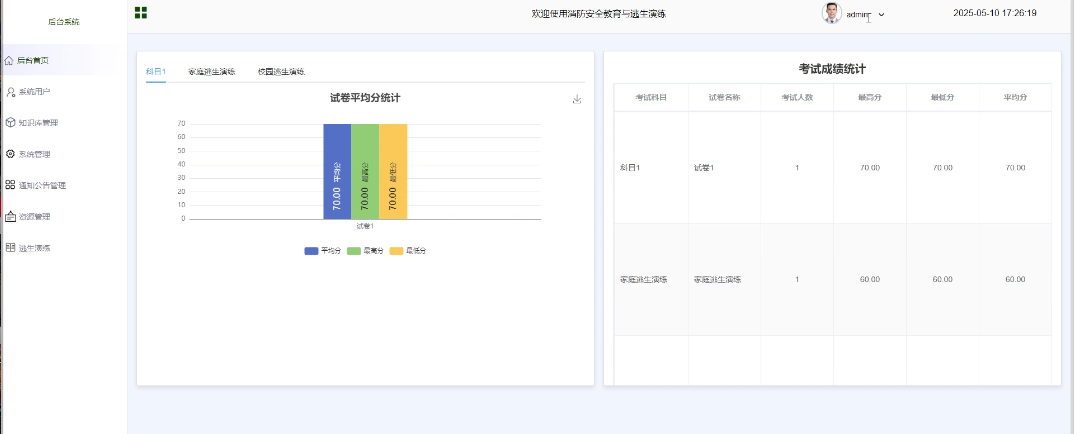 - 后台首页:管理员登录后台的起始界面,该界面主要展示系统重要信息概览和提供数据统计分析(展示如试卷平均分、考试成绩等统计图)。