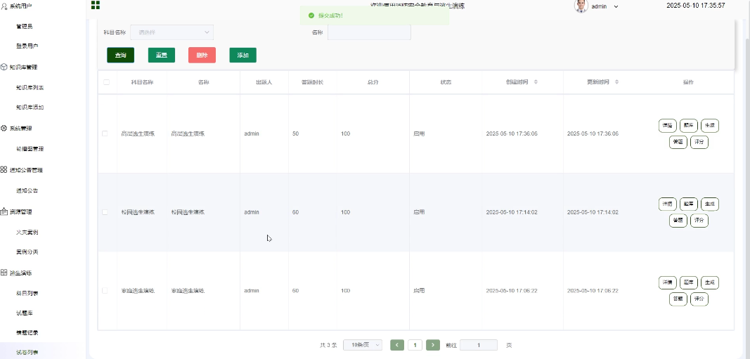 - 逃生演练:管理员可管理所有逃生演练信息,提供科目列表、试题库、错题记录及试卷列表等子功能模块,支持创建试题,进行科目分类管理,发布试卷,查看错题等操作。