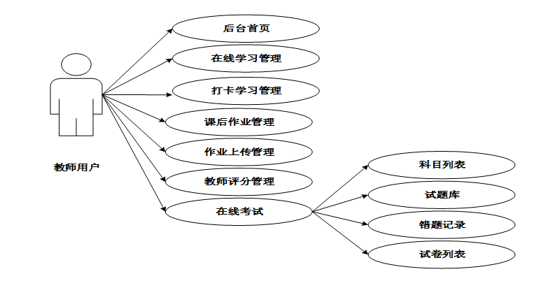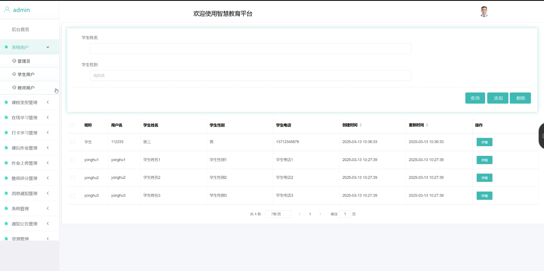 系统用户:管理平台的所有用户,包括教师、学生等,可以进行用户的增删改查操作。