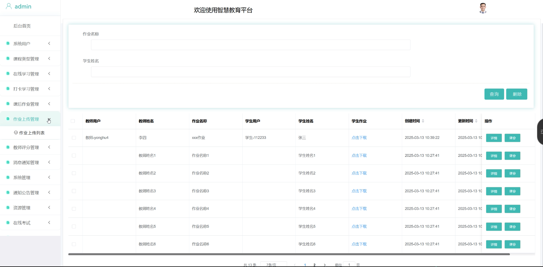 作业上传管理:管理员可以查看、管理学生提交的作业,确保作业按时上传和检查。