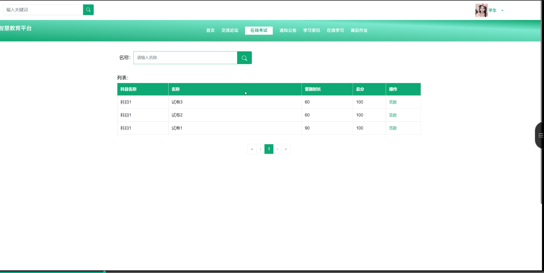 在线考试管理:管理平台的考试科目、试题库、错题记录、试卷列表,安排考试任务。