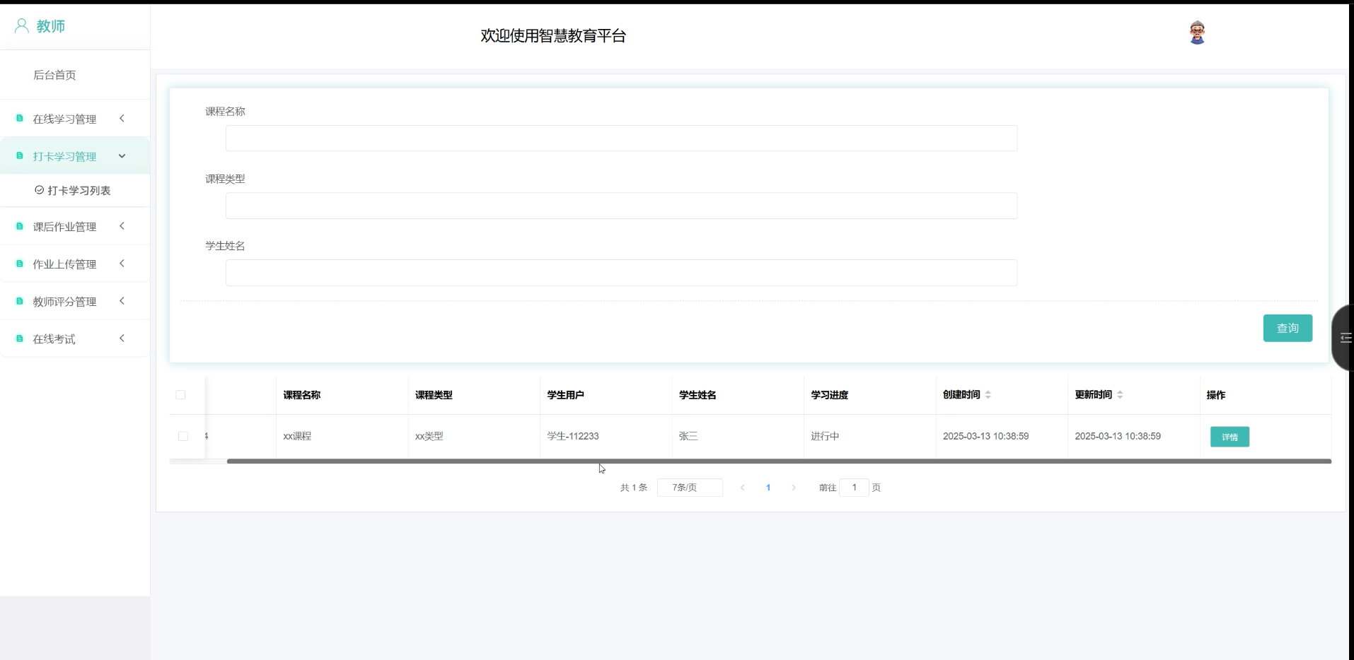打卡学习管理:管理和监控学生的学习打卡,确保学生按时完成学习任务。