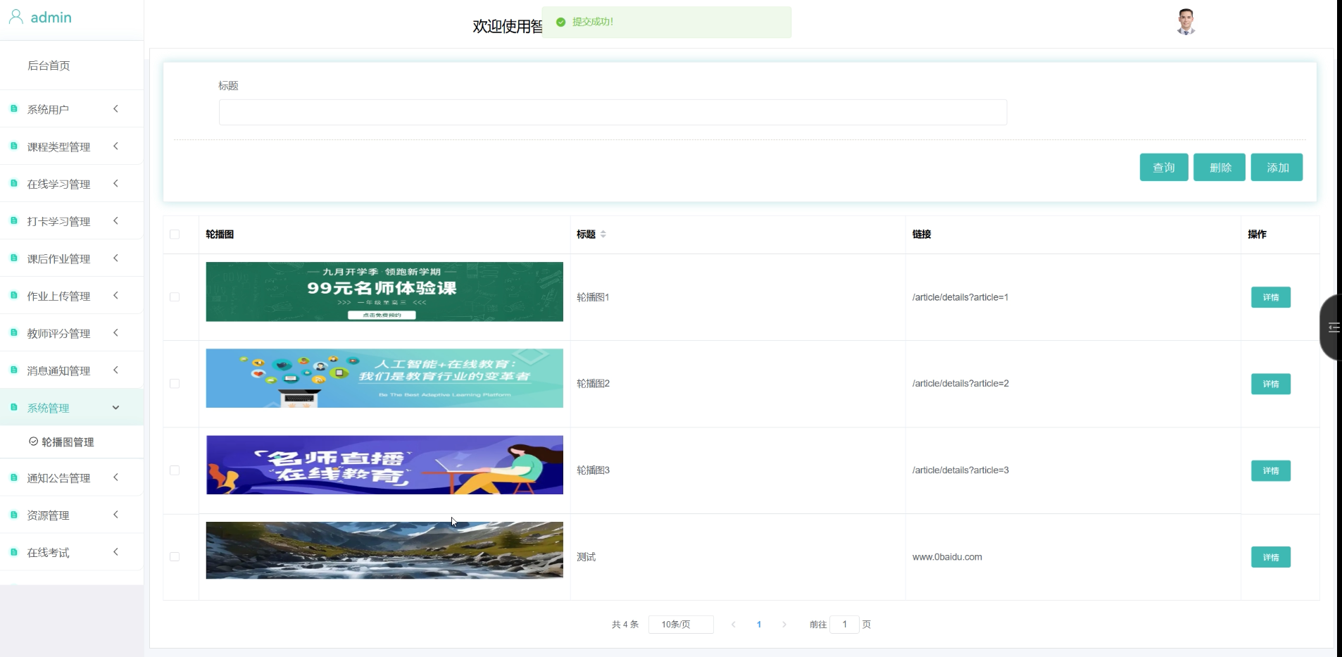 系统管理(轮播图管理):管理平台首页的轮播图展示内容,更新平台宣传和信息。
