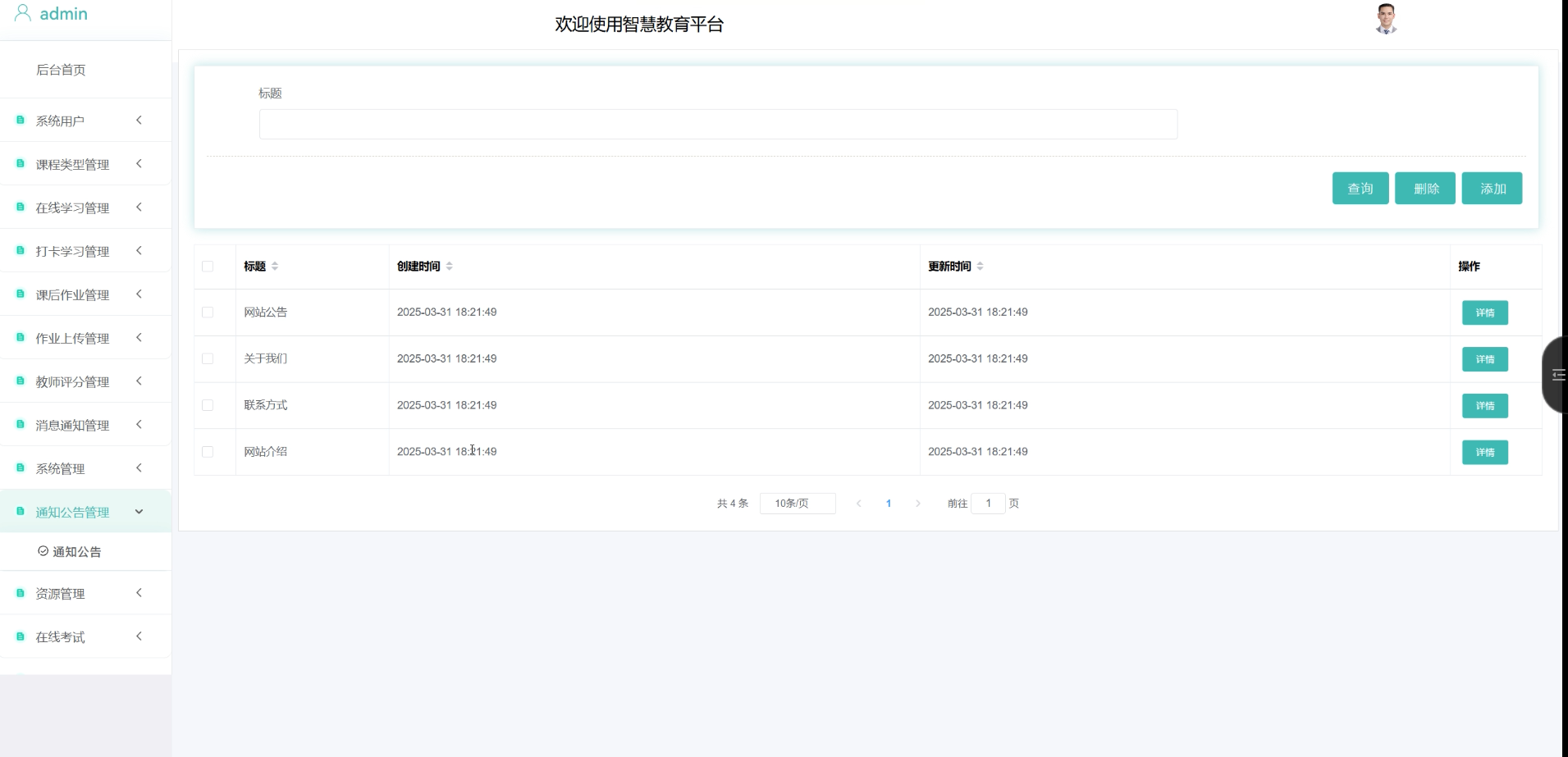 消息通知管理:发布平台的公告和消息,通知学生和教师有关学习、考试等事项。